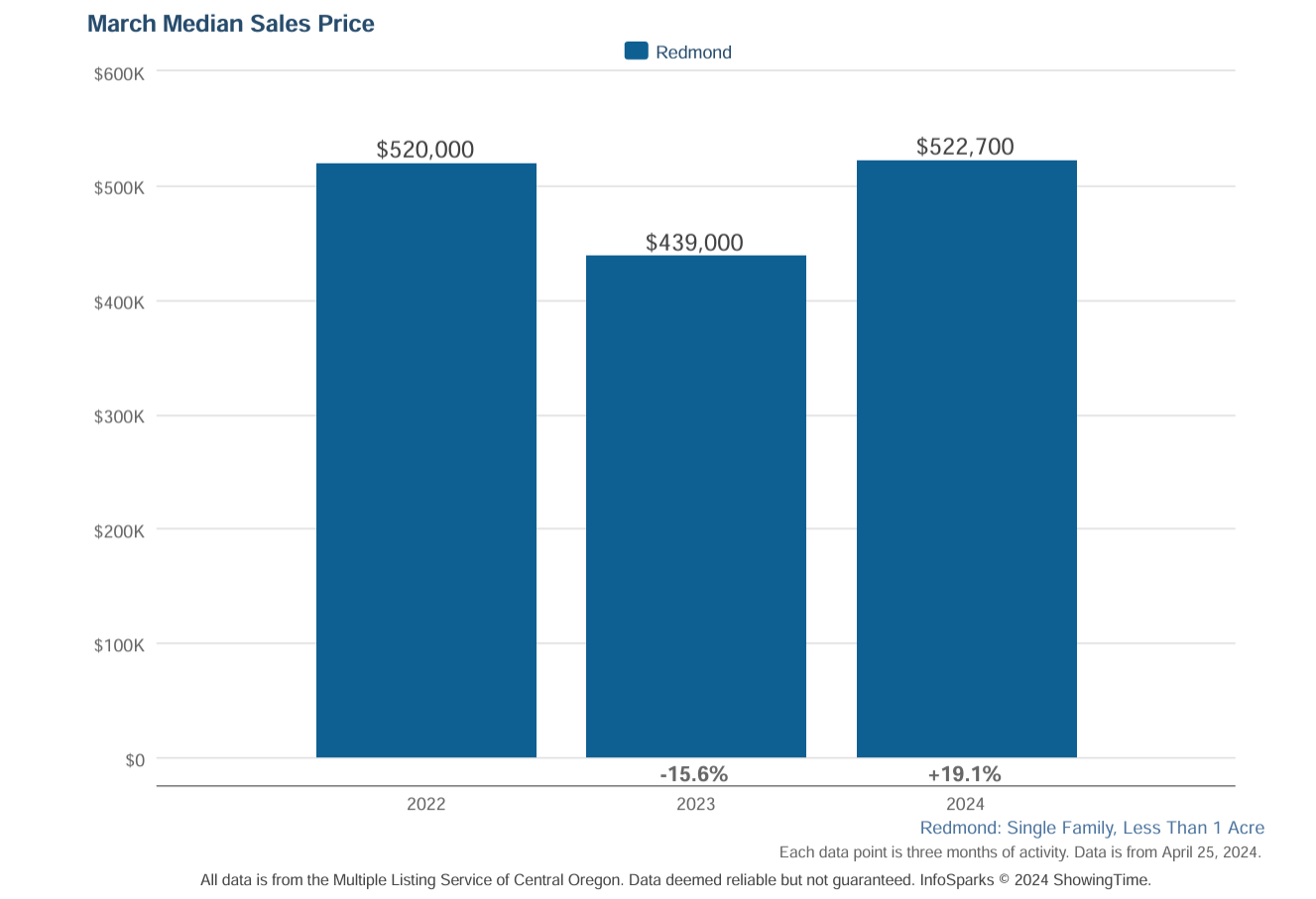 After dropping 1st quarter 2023 from 1st quarter 2022, Redmond single family home prices rose 1st quarter 2024. The relative affordability of Redmond compared with other urban areas in Deschutes County (i.e. Bend, Sisters and Sunriver), has led to an influx of new purchasers and demand for those who cannot qualify to purchase homes elsewhere. That and a growing number of local events and an active city council keeping up with infrastructure needs has led to a vibrant community for which demand cannot keep up with new inventory; rising home prices have been the result.