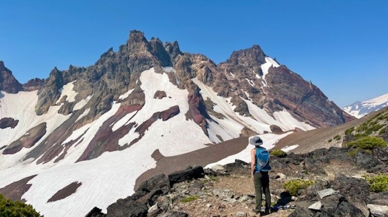 Past Tam McArthur Rim, the unmaintained trail to Broken Hand and Broken Top had abundant wildflowers for this alpine area as well as heavier snow patches than experienced in past years. The approach to Broken Hand involves scrambling over rocks and climbing several cinder ridges before reaching this rugged, rocky prominence. To pass it this July involved either detouring around the rocky base, hiking over snow fields, or trekking directly over snow on Broken Hand's westside. Either way people needed to be careful to avoid falling and sliding down the snowy hill. The majority of people appeared to be going directly over the snowy side of Broken Hand.