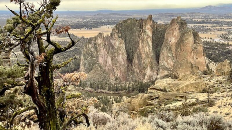 For those looking to undergo a challenging Central Oregon hike when the Cascades are covered with snow, Smith Rock State Park can provide many options. Typically very busy in the summer when rock climbing is at its peak and the weather warm, winter hikes in Smith Rock can be rewarding with fewer crowds and different perspectives of the rocks. Before sections of the park are shut off in the spring due to falcon nesting, hikers can explore little known social trails and see portions of the park rarely visited. However, for those who wish to exert themselves, hiking along the Wolf Creek trail until connecting with Burma Road, climbing it and then hiking the north side of the park along the Summit Trail, then up Mesa Verde until connecting with Misery Ridge and climbing the backside past Monkey Face to the summit until returning down to Crooked River and then up the canyon to the parking lot can be a fulfilling winter hike of over six miles and close to 1800 feet of elevation gain. During the winter, sometimes weather conditions can create icy patches, so microspikes and trekking poles can be helpful. But if the weather cooperates, the Burma Road, Misery Ridge Loop can be a wonderful challenge.