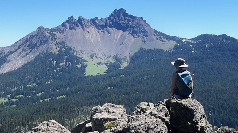 While the higher Cascade Mountain hikes were still snow covered in mid July 2025, Maxwell Butte was snow free and offered spectacular mountain views. On July 12, only one other hiker was seen the entire day and while mosquitoes were a problem in the morning, they were gone once the sun rose. The hike from the trail head to the top of Maxwell Butte is a moderate, forested trek with 2453 feet of elevation gain over 5.10 miles one way; the last steep mile up the butte can be more challenging with switchbacks on pumice on parts of the path. However, the higher hikers get, the more the views of Mt. Washington, North and Middle Sister, The Husband and the Wife become visible until near the top, the full view of Tam McArthur Rim and Broken Top can also be seen. Hoodoo Ski Bowl and Hayrick Butte really stand out as well in the topography in a way that is not visible from lower elevations. Looking east, Three Fingered Jack dominates the skyline and north, fabulous views of Mt. Jefferson, Mt. Hood and the eight lakes basin are seen.