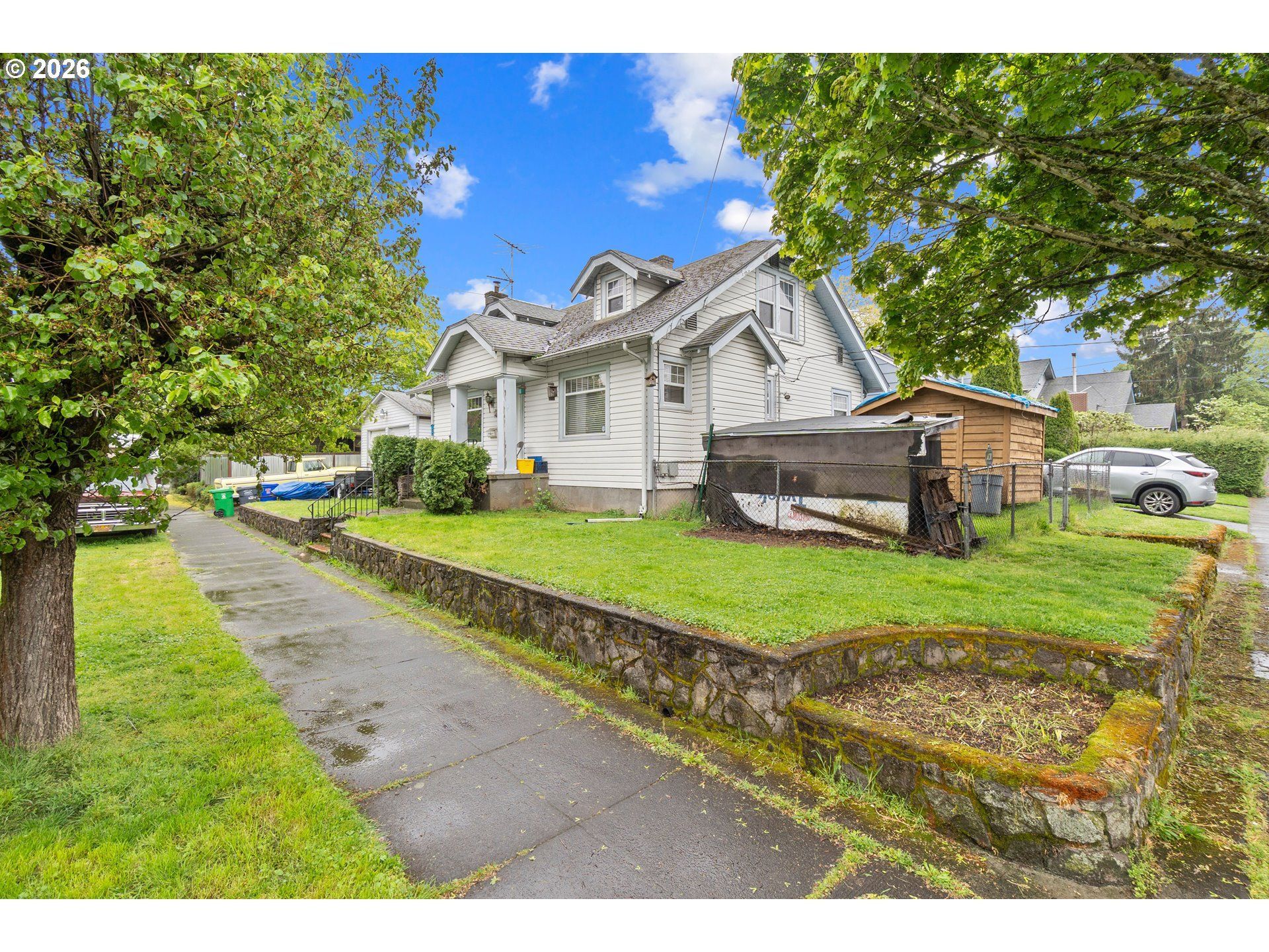 Piedmont Opportunity. Traditional home on a full size lot with a rare double-car detached garage. Living room with hardwoods and fireplace. Spacious dining room. Updated kitchen with custom cabinets and dining nook. Main level with expanded primary bedroom. Updated full bath on main with double sinks. Two bedrooms upstairs. Unfinished basement down. Many updated windows. Solar panels - extremely cheap electrical bills. The home needs work. Fantastic location close to Peninsula Park and community center, Dekum Triangle, New Seasons, and much more. [Home Energy Score = 1. HES Report at https://rpt.greenbuildingregistry.com/hes/OR10247598]